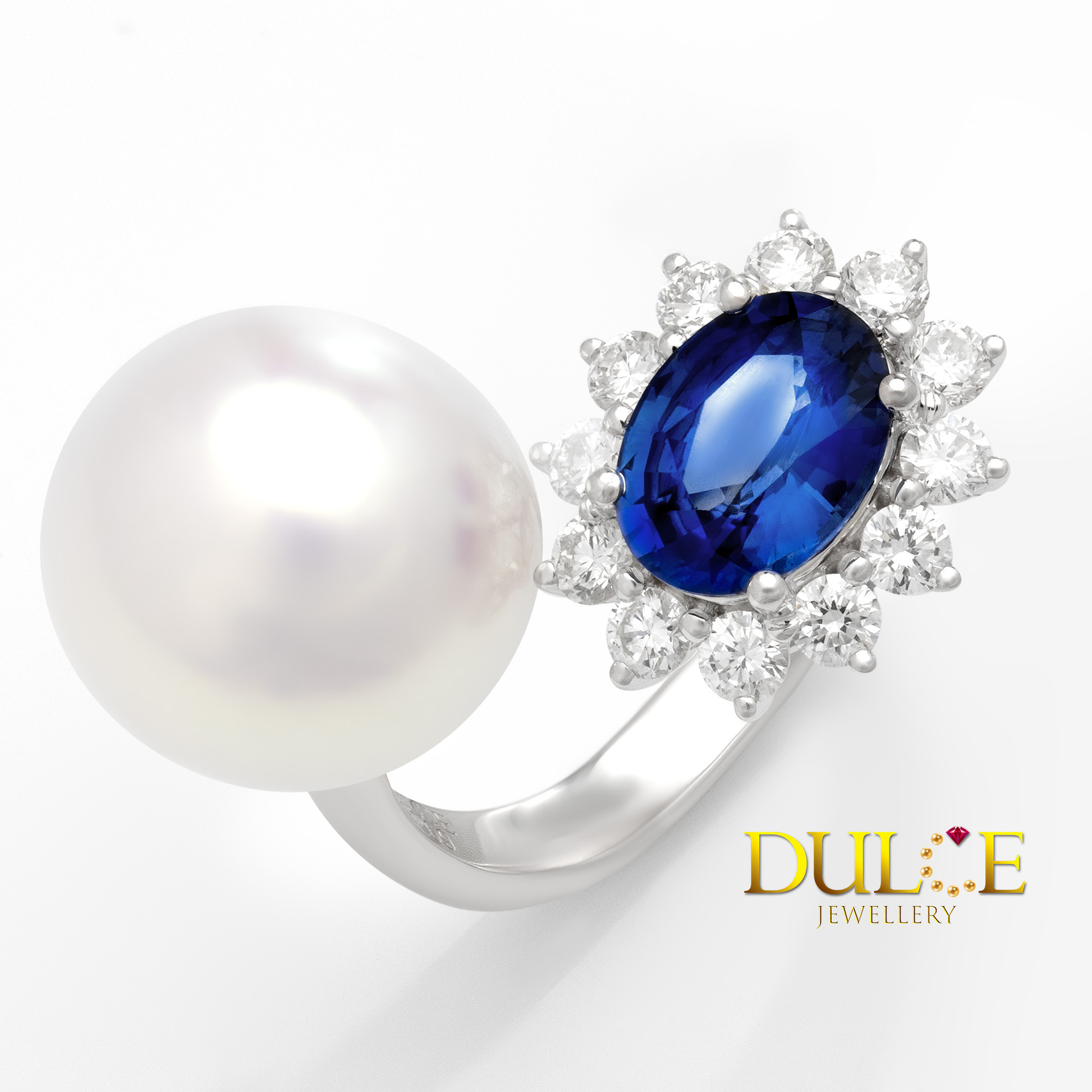 18K Gold Blue Sapphire & Freshwater Pearl Diamond Ring