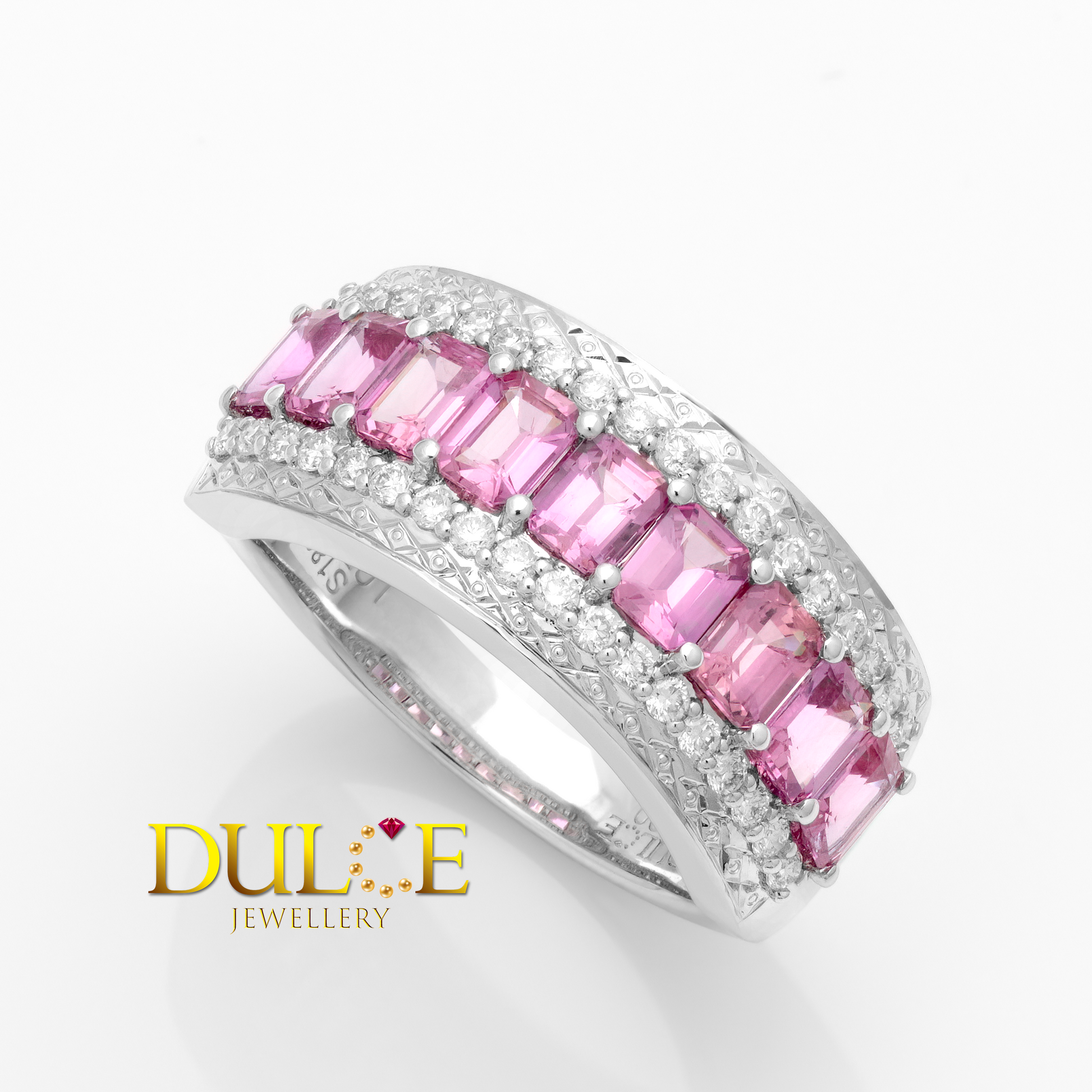 14K金:5.22克 天然粉紅藍寶石:1.82克拉 培育鑽石:0.35克拉(D VS) |