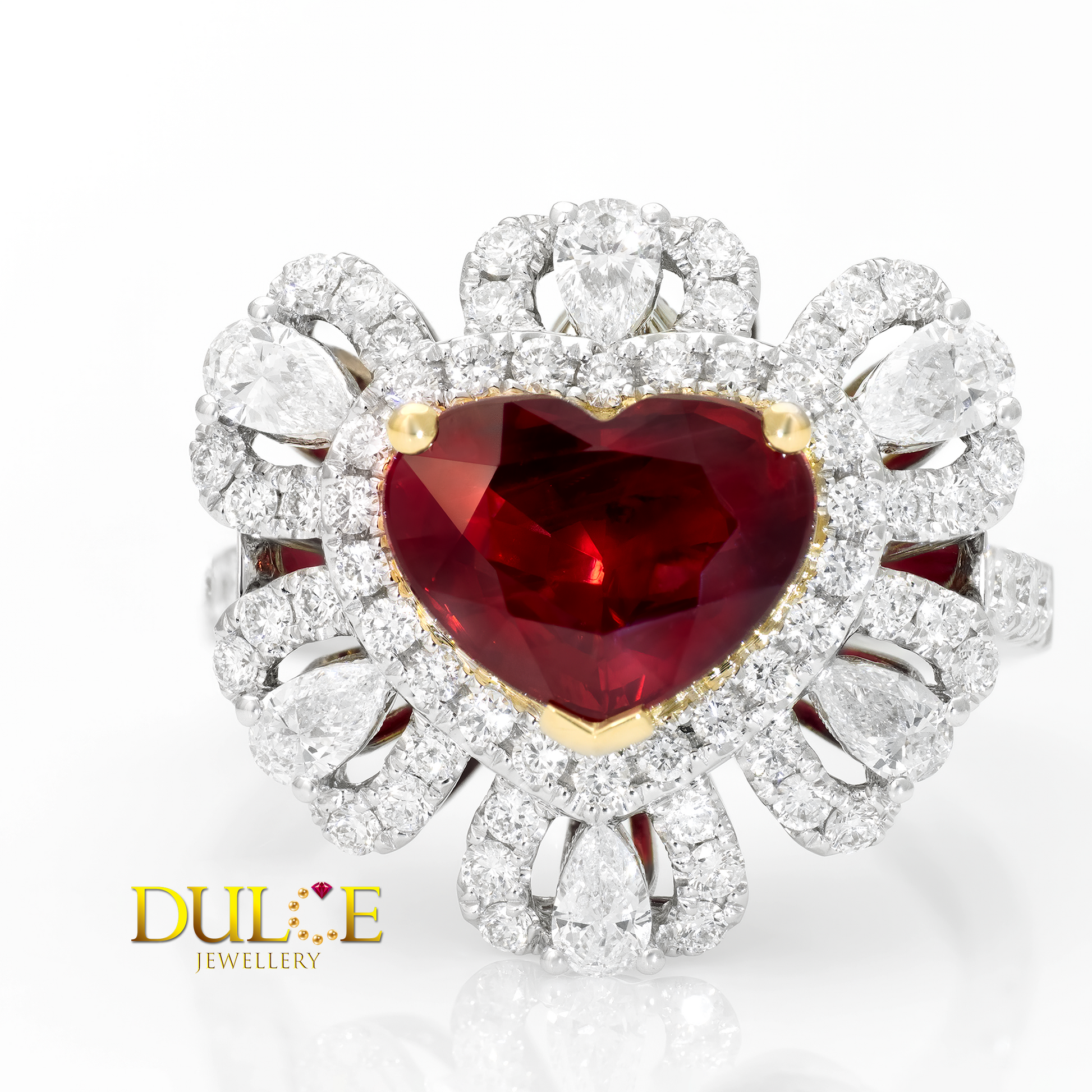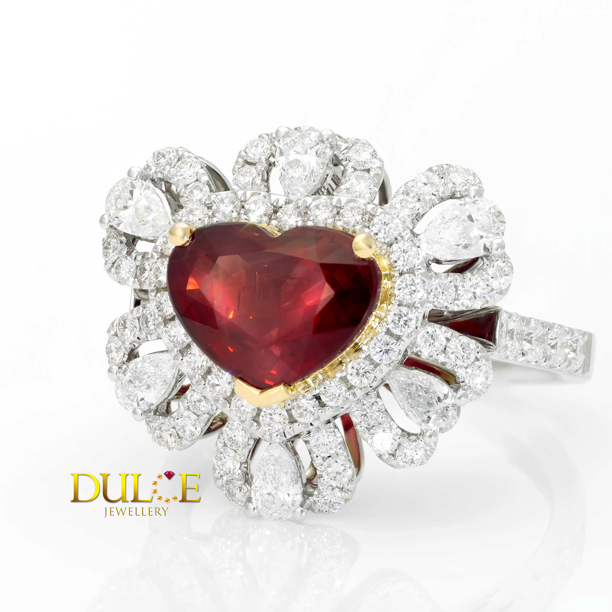 18K金:7.75克 鴿血紅寶石:3.0克拉 鑽石:1.51克拉(E/F VS) |