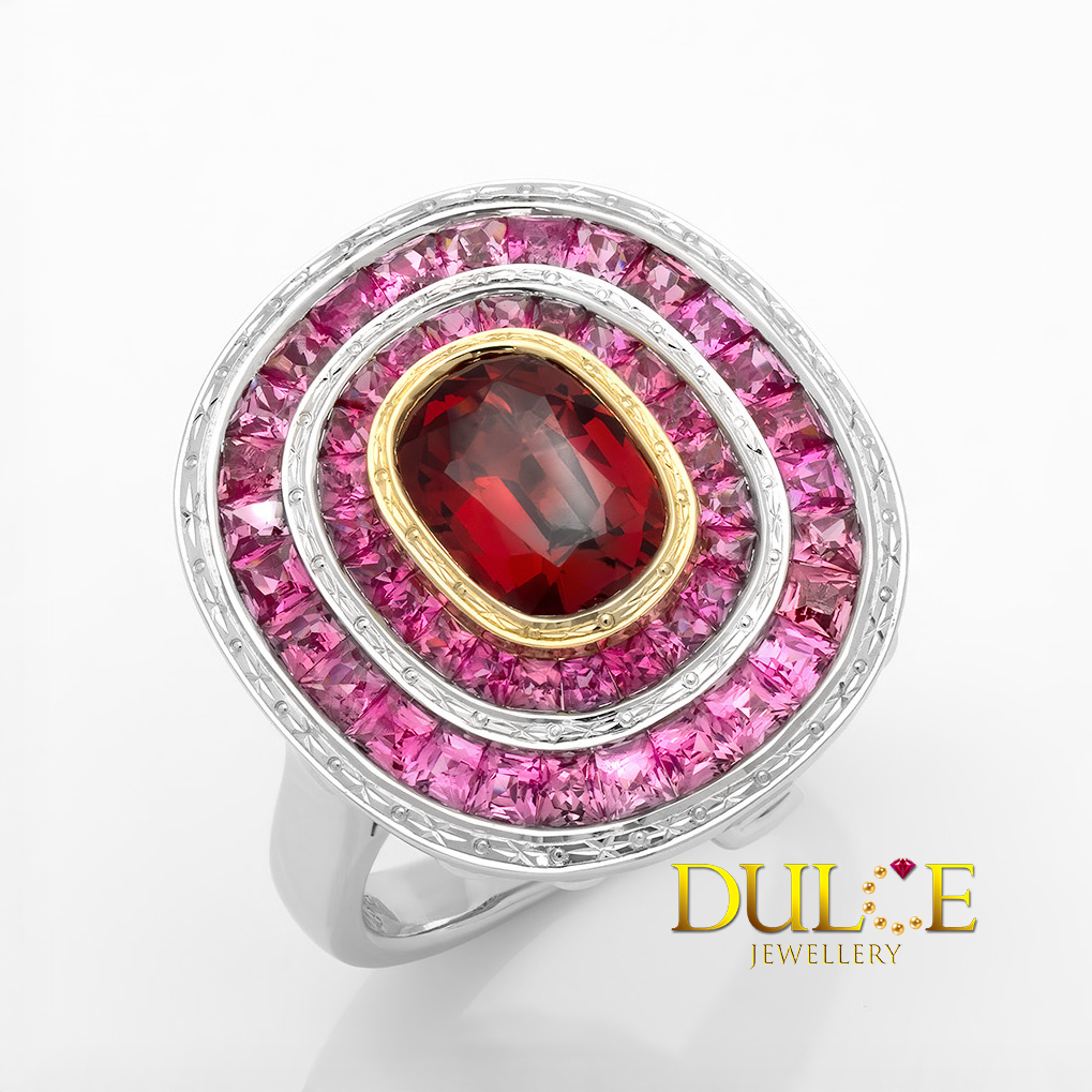 18K 金紅色尖晶石和粉紅色尖晶石光環戒指