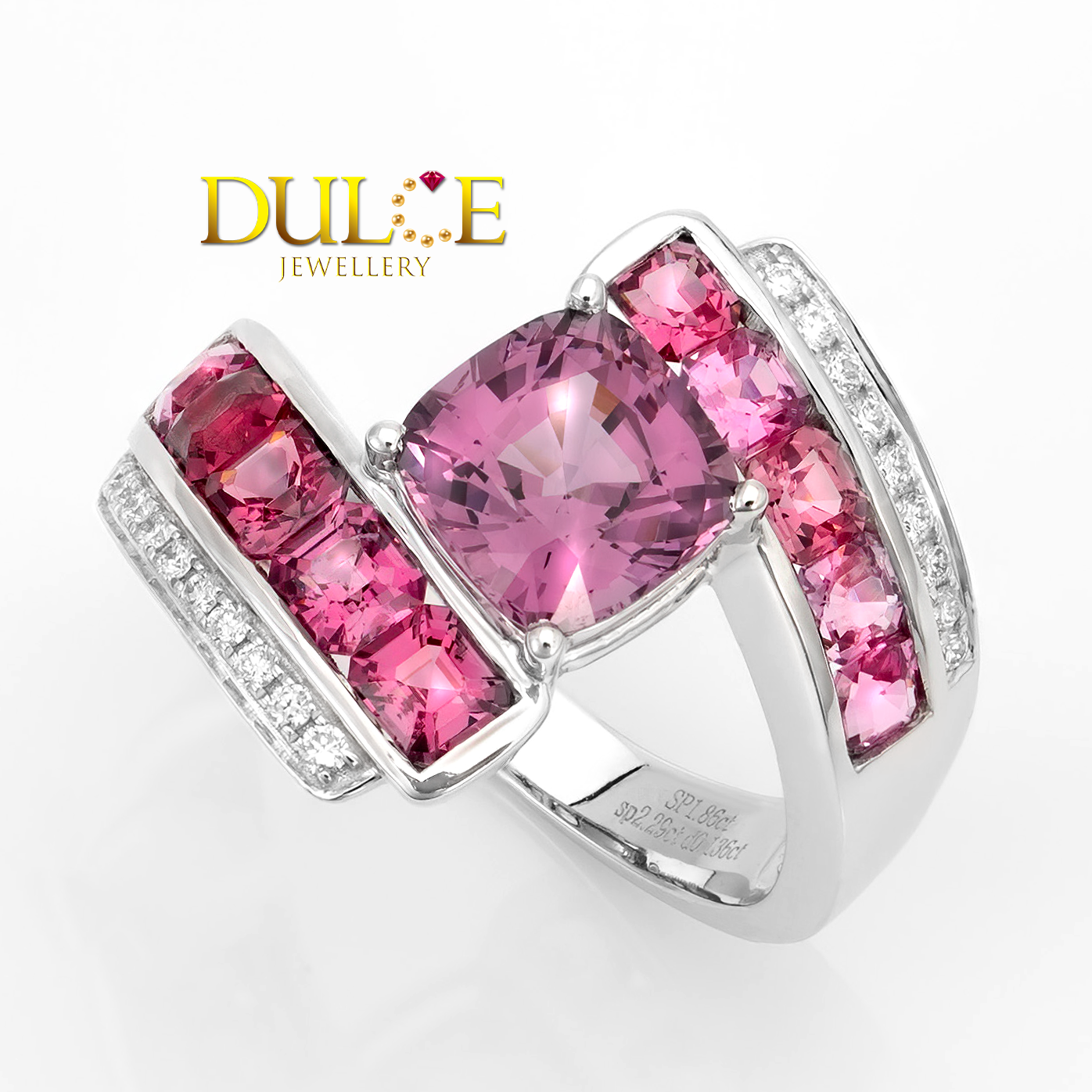 18K金:6.39克 尖晶石:1.86+2.29克拉 鑽石:0.136克拉(E/F VS) |