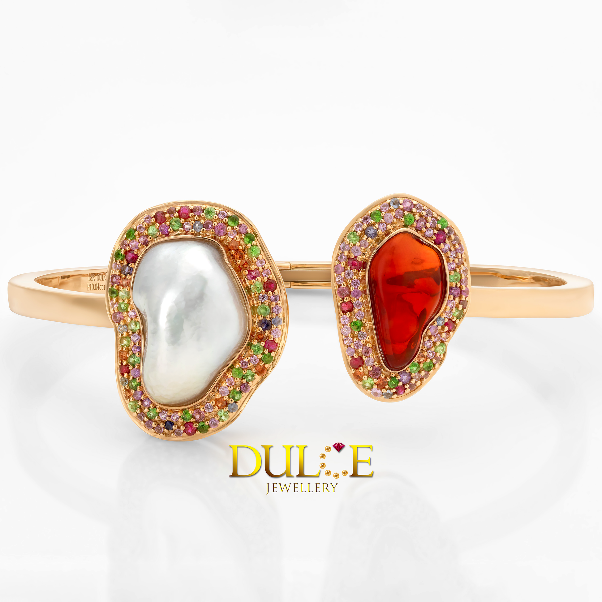 18K金:26.72克 墨西哥火蛋白石:2.72 克拉 南海克希珍珠:11.5 毫米 x 16 毫米 沙弗萊石:0.75克拉 藍寶石: 0.37 克拉 紅寶石:0.17克拉 |