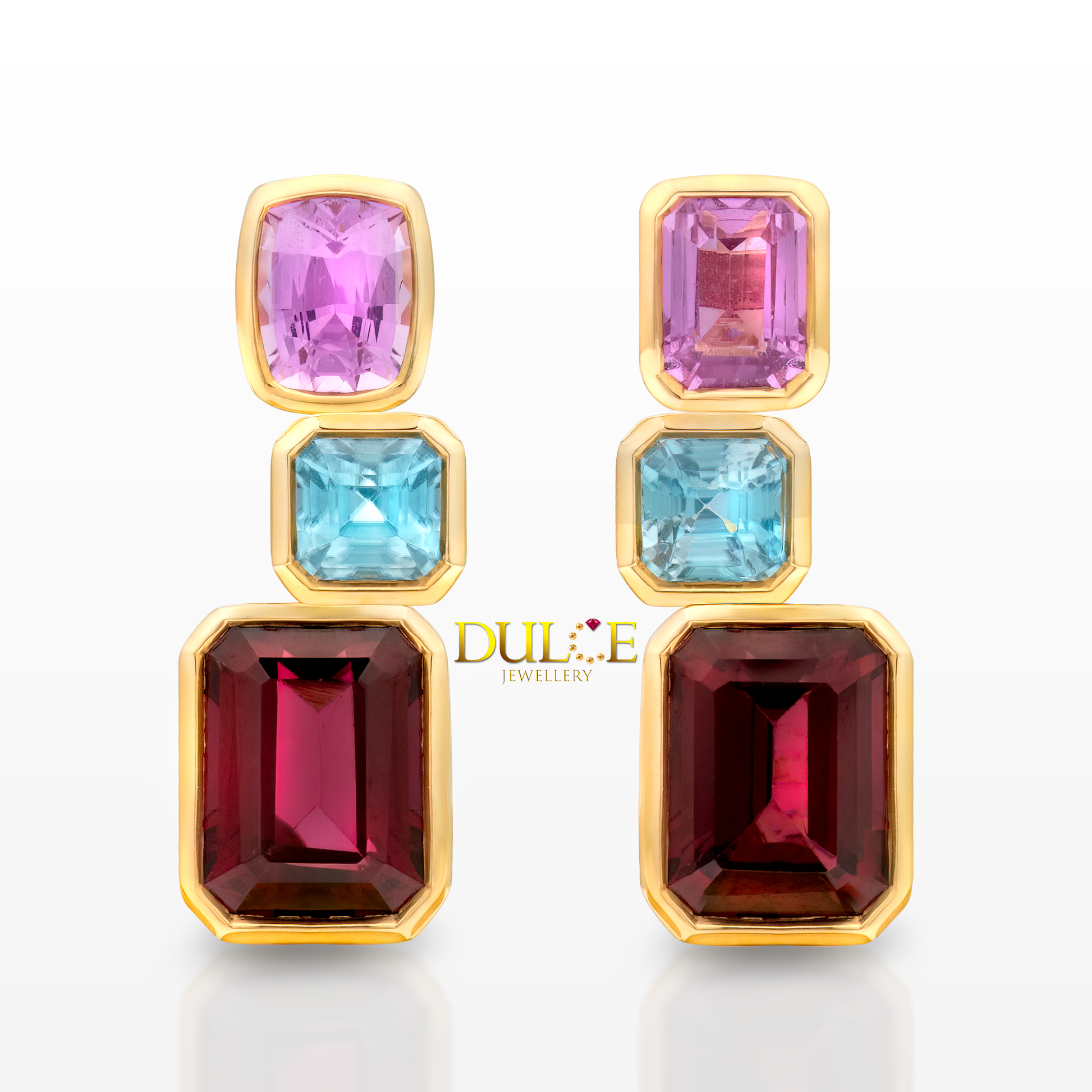 18K金粉紅藍寶石、紅石榴石和藍風信子耳環