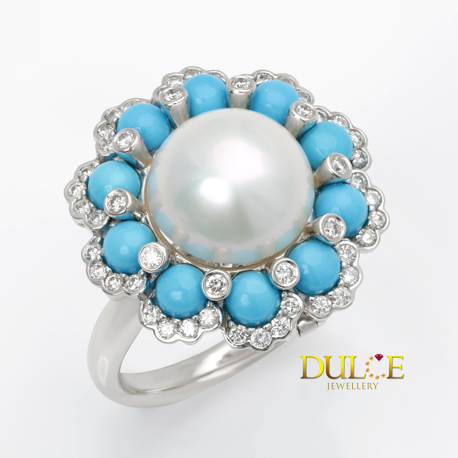 18K金:6.57克 睡美人綠松石:1.68 克拉 鑽石:0.59 克拉(E/F VS) 10 毫米淡水珍珠 |