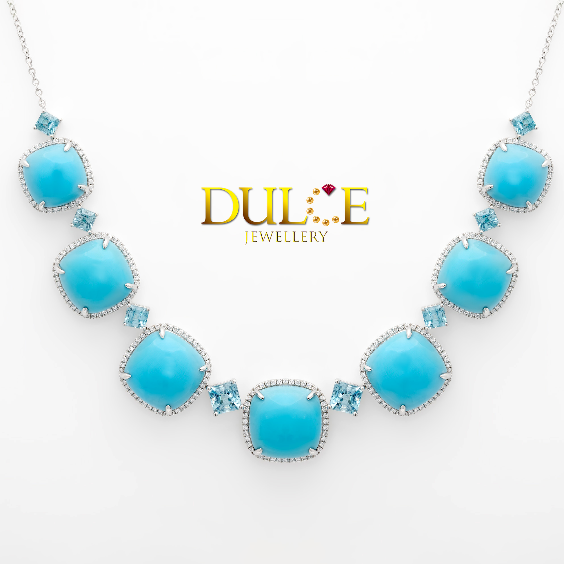 14K金:21.07克 睡美人綠松石:82.38克拉 藍色風信子:11.05克拉 鑽石:1.91 克拉(E/F VS) |